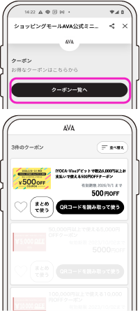 期間中、AVA LINE公式アカウントの友だち登録をしていただくと、AVAショッピングモール全館で、その場で使えるIYOCAまたは伊予銀行Visaデビット専用の500円OFF電子クーポン(最大3枚)をプレゼント。 クーポンは、IYOCAまたは伊予銀行Visaデビットで税込5,000円以上お支払いごとに、お支払い金額に応じてご利用いただけます。