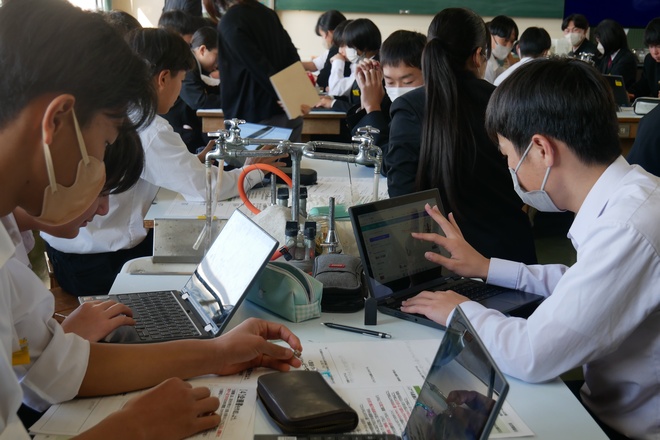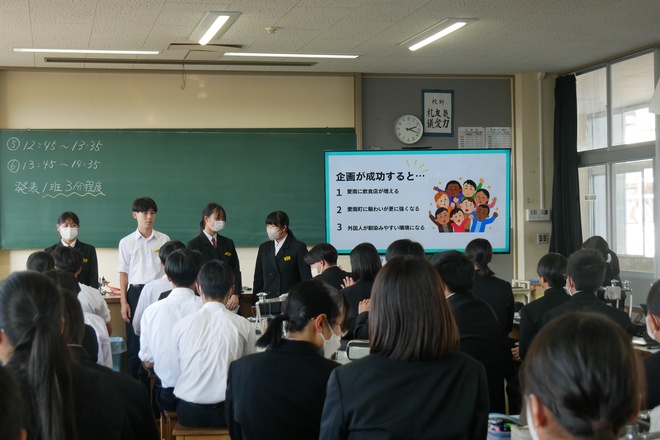地元について考え、地域の課題を解決する新しい商品やイベントなどを企画するカリキュラム「愛南を愛そうプロジェクト」を2日間で合計4コマ実施。1日目はSWOT分析で愛南町の強みや弱みを把握した後、各グループで地域を元気にするアイデアを考えました。2日目にはアイデアを企画に成長させ、Canvaを使用してスライドを作成し、中学生らしい楽しい企画をプレゼンしました。