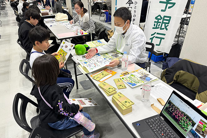 愛媛県専修学校各種学校連合会主催で、小・中・高校生等を対象にした職業体感イベントが3月7日(土)、8日(日)に開催されました。会場のアイテムえひめには、約120職種の職業ガイダンスブースや約30職種の職業体験ブースが出展されました。当行は7日(土)に「銀行員」の職業ガイダンスブースで参加し、銀行クイズや札勘での銀行員体験などを実施。たくさんの子どもたちに立ち寄っていただきました。
