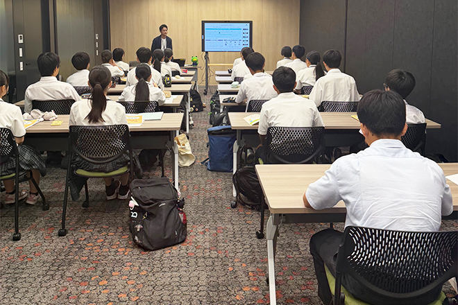 愛媛県立松山東高等学校の生徒20名が『locus』という探求学習プログラムの一環で本店に来行され、伊予銀行の紹介、銀行の役割、本店営業部の見学を行いました。