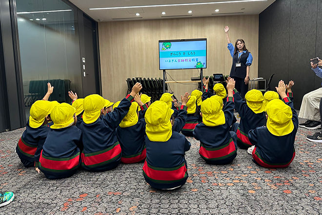 認定こども園小羊園の年中園児24名の銀行見学を本店にて実施しました。会議室に入り、6月に実施した出前授業の復習や銀行業務についての学習をしたあと、本店営業部を見学しました。終始楽しく見学できました。